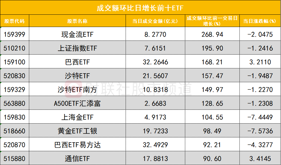 从成交额环比增长前十的ETF来看,现金流ETF(159399)成交额环比增长268%位居首位;上证指数ETF(510210)成交额环比增长195%位居次席。