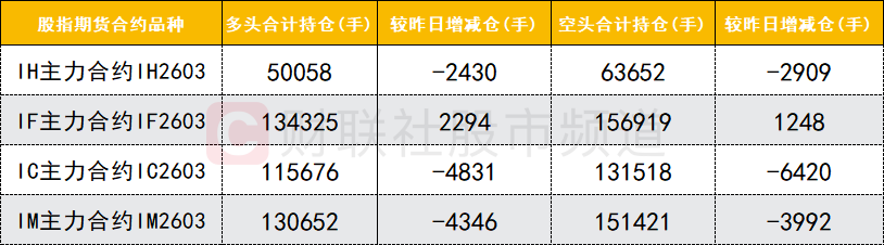 四大期指主力合约中,IH、IC、IM合约多空双方均减仓,IC合约空头减仓数量较多。