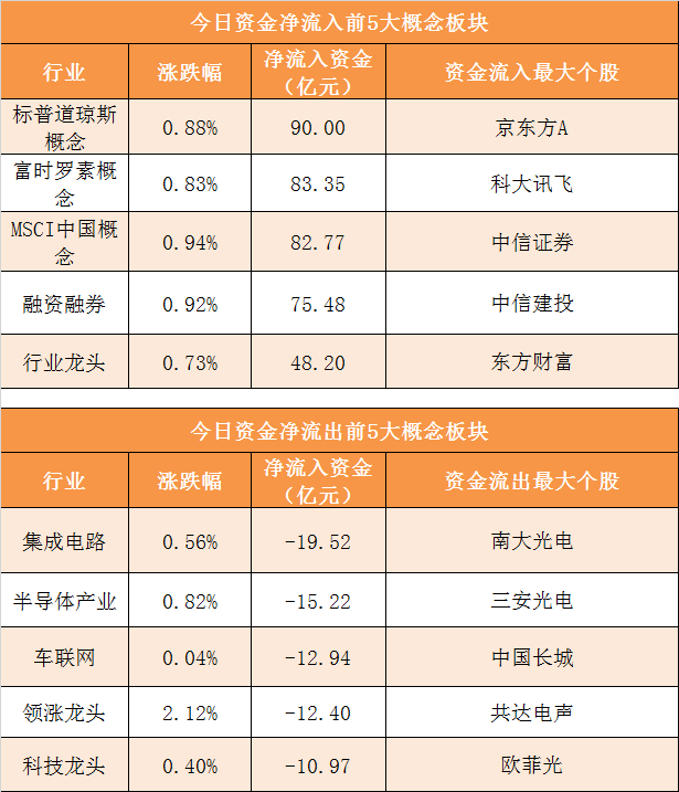 概念板块方面,今日标普道琼斯概念、富时罗素概念、MSCI中国概念、融资融券等概念板块资金呈现净流入,其中标普道琼斯概念净流入90亿元居首。