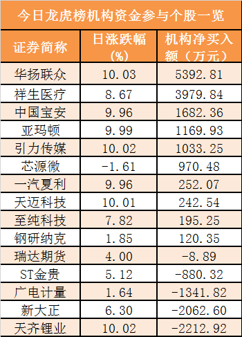 盘后龙虎榜数据显示,机构现身15股,其中华扬联众等10股呈现机构资金净买入,天齐锂业等5股呈现机构资金净卖出。