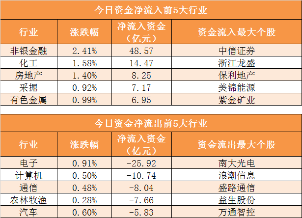28个申万一级行业中,18个行业实现资金净流入,其中非银金融行业净流入48.57亿元居首。