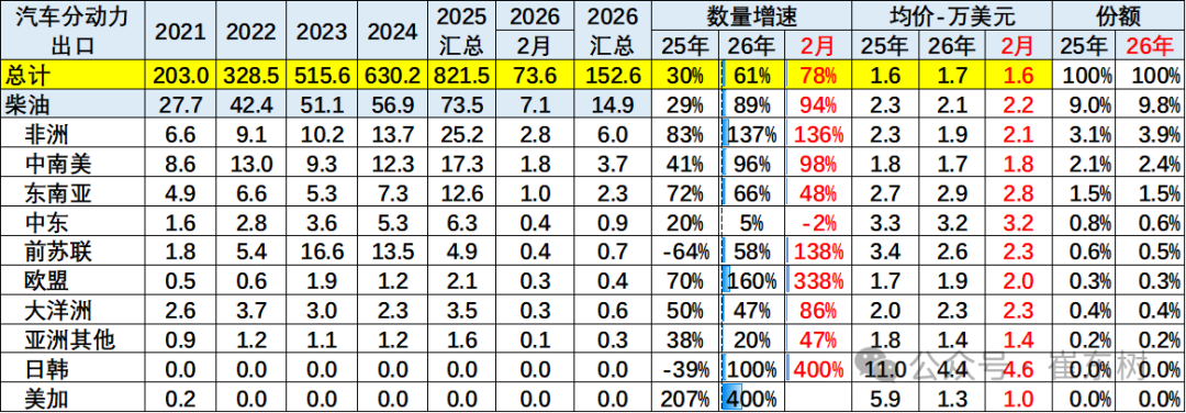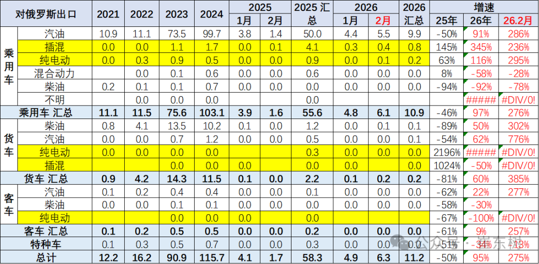 2024年全年中国汽油车型出口348万辆、增22%;2025年中国汽油燃油车出口355万辆、增2%,2026年1-2月中国汽油燃油车出口59万辆、增28%。今年中国对俄罗斯、非洲、美加、亚洲其它市场的燃油车市场较强,其它市场总体表现一般,尤其是欧盟、东南亚等市场的燃油车出口下降,高质量发展特征明显。