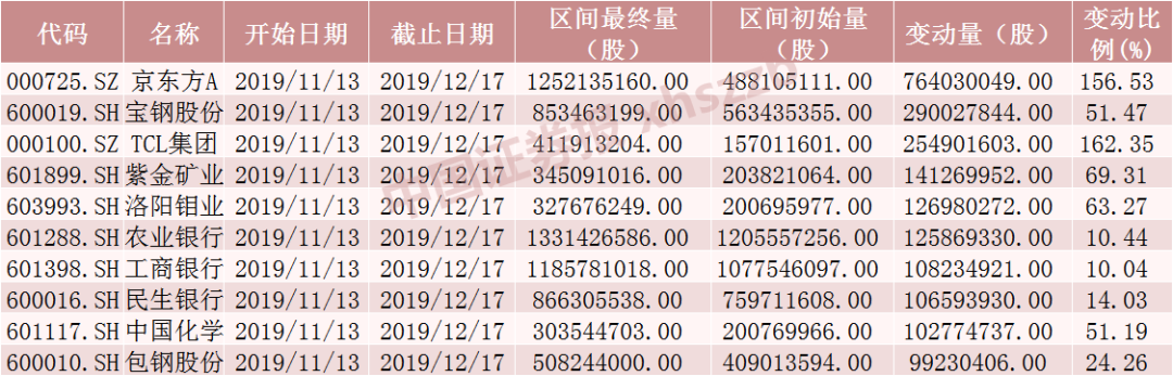 加仓股票数量位居前三的分别为京东方A、宝钢股份、TCL集团,加仓股数分别为7.64亿股、2.90亿股、2.55亿股。