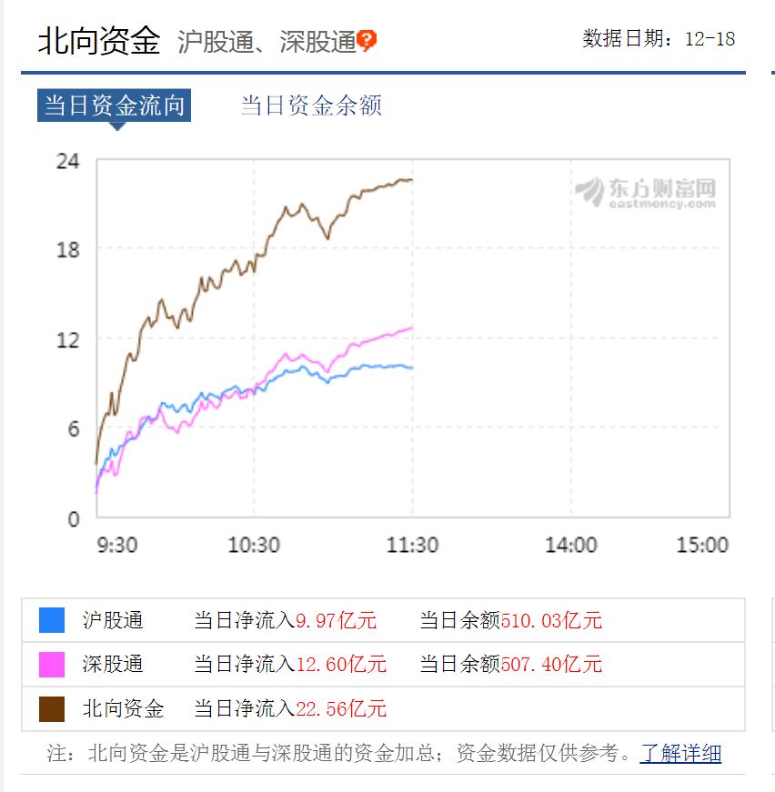 虽然今日两市震荡调整,但北向资金持续净流入的步伐仍未停止。截至午间收盘,北向资金已净流入22.56亿元。