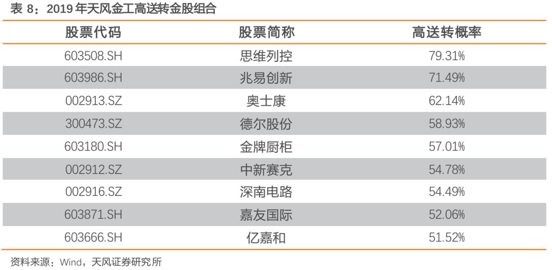 天风证券根据以下条件进行筛选,得出2019年高送转预测列表,思维列控、兆易创新、奥士康、德尔股份等2019年年报高送转概率较高。