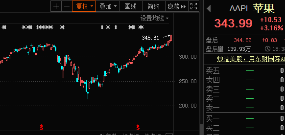 科技股开启狂欢模式,苹果、亚马逊、微软、Facebook均创历史新高。苹果涨3.16%,市值逼近1.5万亿美元。亚马逊涨3.04%,奈飞涨3.47%,谷歌涨0.66%,Facebook涨3.14%,微软涨0.76%,特斯拉跌0.97%。