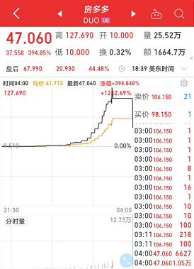 中国在线房产交易服务平台房多多(NASDAQ:DUO) 股价周二盘中一度涨1256.89%,14次触发熔断。在尾盘接近一个小时的暂停交易后,房多多打开熔断,股价瞬间跳水,截止收盘股价报47.06美元,市值达1.5亿美元,涨幅394.85%,创下去年11月份上市以来最大单日涨幅及股价收盘新高,股价已较上市首日收盘价上涨逾260%。