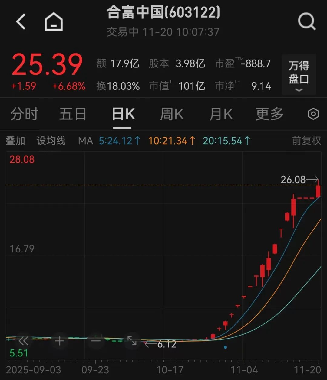 昨日晚间,合富中国公告称,公司股票将于2025年11月20日开市起复牌。自10月28日至11月14日,公司股票连续十四个交易日中有十二个交易日以涨停价收盘,累计涨幅高达256.29%,远超同期行业及上证指数涨幅。