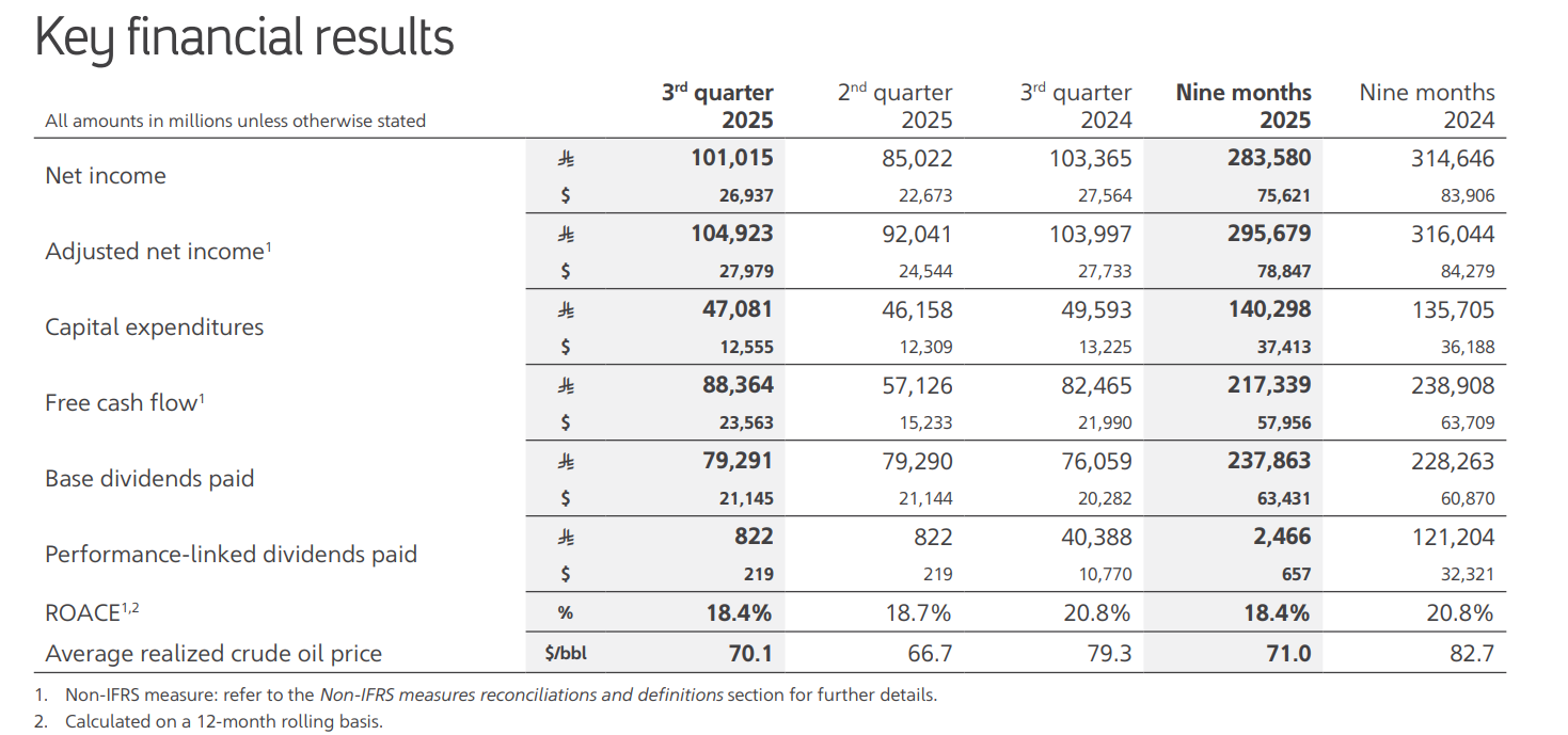 该公司还宣布,第三季度的自由现金流为235.6亿美元,不仅较上季度的152.3亿美元大幅提高,而且还高于去年同期的220亿美元。董事会还宣布,2025年基本股息为211亿美元,业绩挂钩股息为2亿美元,将于第四季度支付。