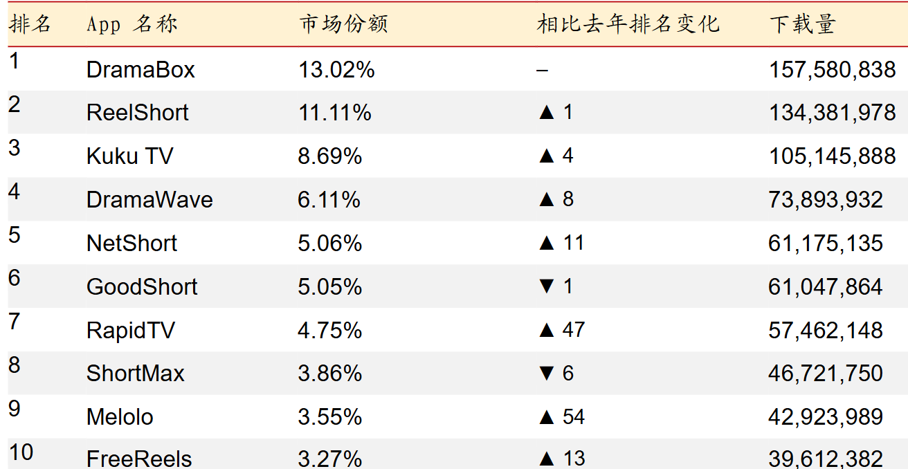 从下载端来看,2025 年全年 DramaBoxAPP 双端以1.57亿次下载量位居第一,ReelShort 以 1.34 亿次下载量位居第2。DramaWave 快速上涨至第4名。