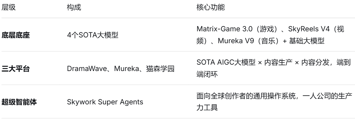 昆仑万维2026年的AGI战略升级为「3+1」生态架构——以4个SOTA大模型为底座,支撑3大AI原生平台+1个超级智能体。