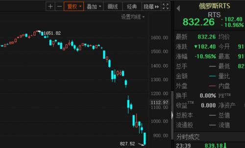 受国际原油价格下跌影响,俄罗斯股市和汇市昨日双双遭遇暴跌。俄罗斯股市暴跌近11%,俄罗斯卢布对美元单日狂贬9.5%。
