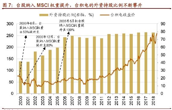 1996年,台湾股票首次纳入MSCI新兴市场指数,首次纳入比例为50%,2000年,纳入比例提升至65%,同年12月继续提升至80%,2005年5月,台湾股票全面纳入新兴市场指数,纳入比例提升至100%。