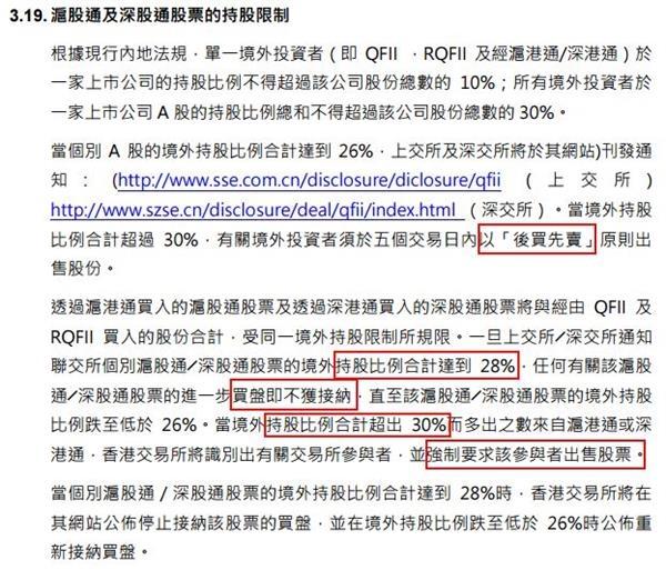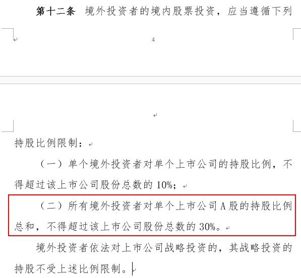 在双方的制度安排上,30%的是上限,确实也有外资触及了某些A股的持股比例上限,也就是所谓的被外资“买爆了”。