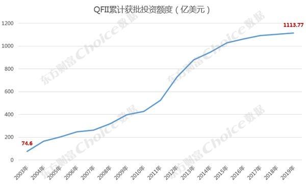 最早的时候,QFII的额度仅有3.5亿美元,而截至2019年,东方财富Choice数据显示,QFII获批额度超过千亿美元,达到1113.77亿(折合人民币超过7000亿元),规模已经不可同日而语。