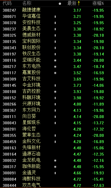 继昨日创业板低价股尾盘暴露风险后,今日低价股续遭重挫,跌停板即跌幅20%个股数量由早盘11只扩大到下午收盘49只,跌幅超过10%的创业板个股有343只。