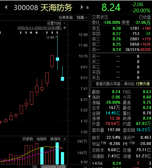 天海防务此前2个星期股价由4元出头,一度涨到了9月9日最高的12.9元,随即大幅下跌,9月10号跌停,股价只剩下8.24元,也就是短短2天时间,股价自高位已经跌去了36%。