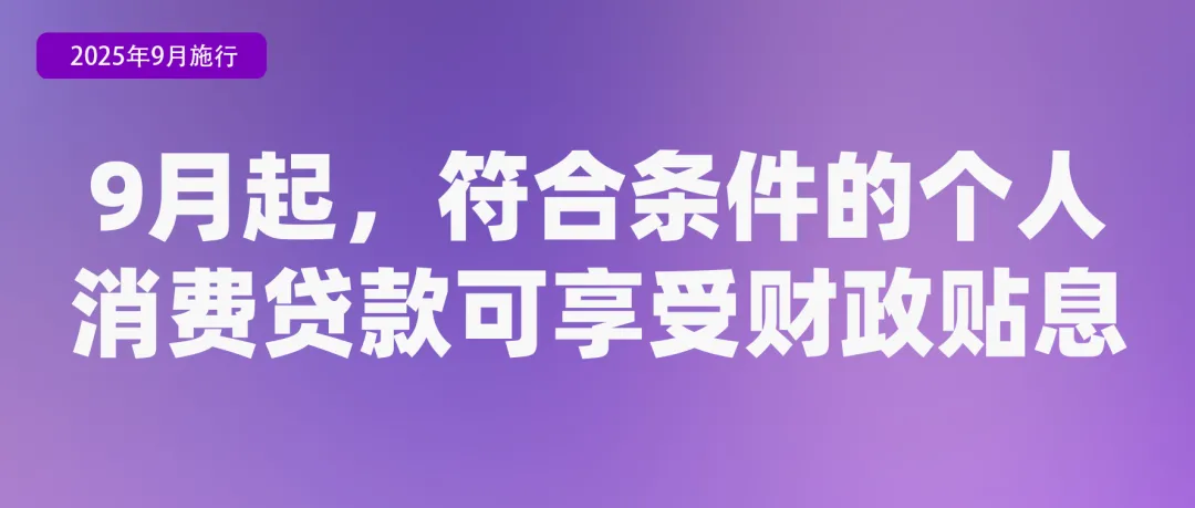 财政部、中国人民银行、金融监管总局印发《个人消费贷款财政贴息政策实施方案》,2025年9月1日至2026年8月31日期间,居民个人使用贷款经办机构发放的个人消费贷款(不含信用卡业务)中实际用于消费,且贷款经办机构可通过贷款发放账户等识别借款人相关消费交易信息的部分,可按规定享受贴息政策。贴息范围包括单笔5万元以下消费,以及单笔5万元及以上的家用汽车、养老生育、教育培训、文化旅游、家居家装、电子产品、健康医疗等重点领域消费。对于单笔5万元以上的消费,以5万元消费额度为上限进行贴息。政策到期后,可视实施效果研究延长政策期限、扩大支持范围。