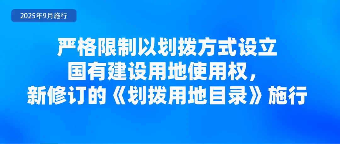 新修订的《划拨用地目录》自2025年9月1日起施行。新修订《目录》明确,严格限制以划拨方式设立国有建设用地使用权。符合本《目录》,确需以划拨方式使用土地的,由建设单位提出申请,经有批准权的人民政府批准,方可以划拨方式提供;建设单位提出或者同意以有偿方式使用土地的,应当依法采取出让、租赁等方式提供。