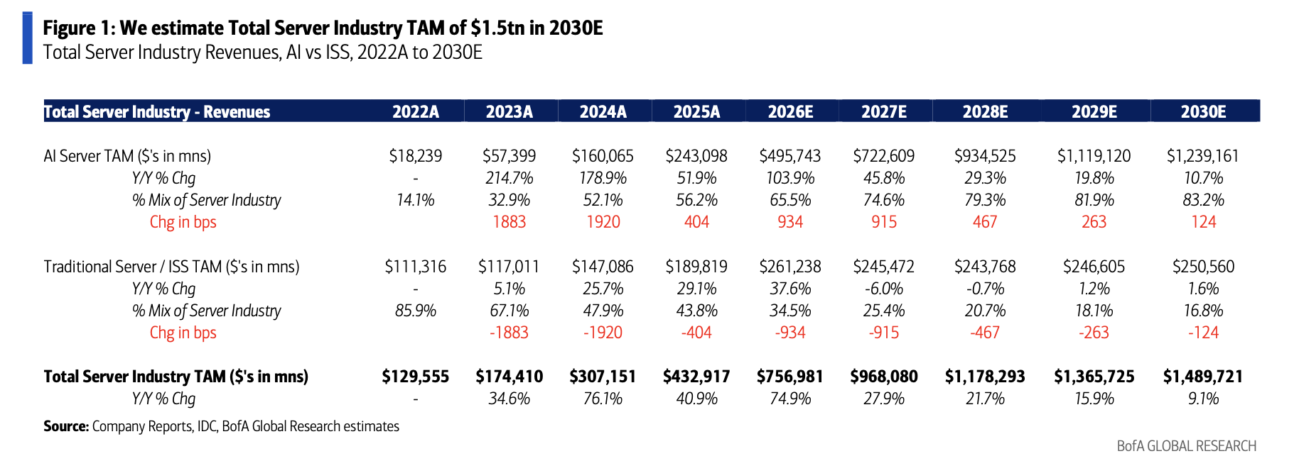 美银IT硬件分析师Wamsi Mohan等人4月16日发布了一份报告,深入分析了IT硬件行业(特别是AI服务器和传统通用服务器)的现状及至2030年的发展趋势。