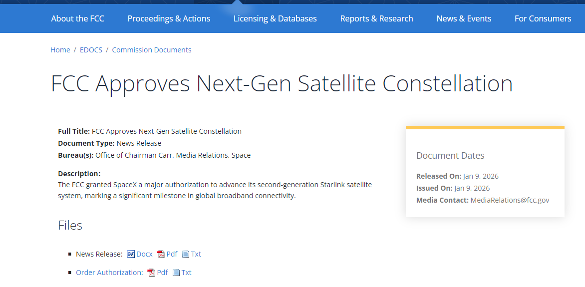 FCC在文件中指出:“即便第二代星链升级型卫星尚未在轨完成全面测试,我们仍认为授权新增卫星符合公共利益。不过,我们暂缓批准其余14988颗拟议中的第二代星链卫星,包括计划在600公里以上轨道运行的卫星。”