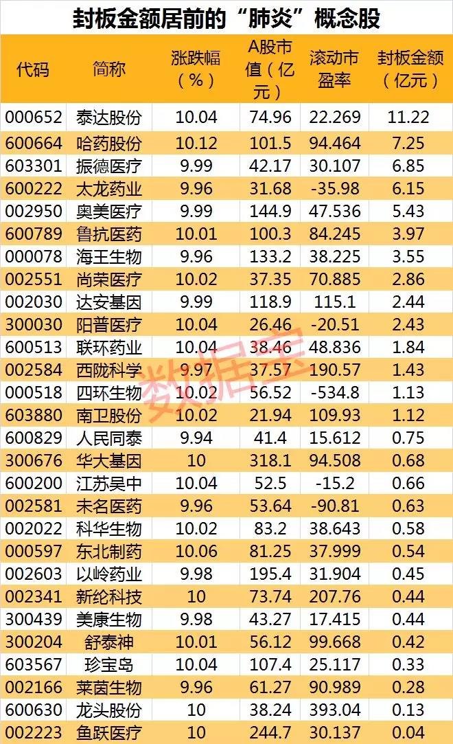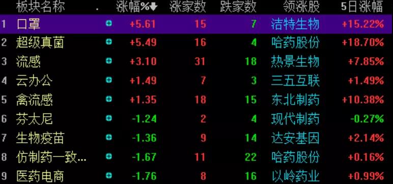 行业方面,28个申万一级行业全部下跌,医药生物行业下跌3.59%,其他行业跌幅均在6%以上,休闲服务、国防军工、钢铁、电子行业跌幅近10%。而概念方面,仅肺炎概念、生物疫苗等抗流感概念逆市上涨。