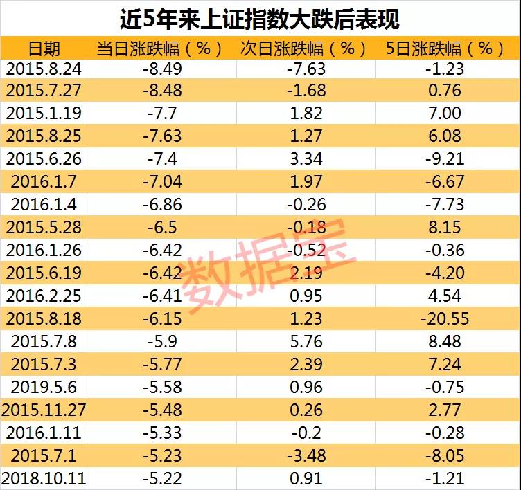 从历史单日大跌数据看,近5年来,上证指数单日最大跌幅为8.49%,发生在2015年8月24日。单日大跌多发生在2015年股指处于高位阶段,彼时股指大起大落比较频繁。最近的一次大跌发生在2019年5月6日,因特朗普决定对中国加征关税,中美贸易战继续恶化导致上证指数大跌5.58%。从大跌后指数表现看,后市上涨概率较高,次日上涨概率63.16%。