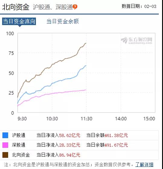 今日A股大跌,但北上资金却逆市抄底,开盘6分钟大幅净流入近30亿元,截至中午收盘,北上资金流入86.94亿元。