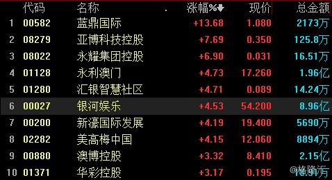 受消息提振,今日港股濠赌股板块全线上扬。截至收盘,永利澳门、银河娱乐、美高梅中国及新濠国际发展均涨超4%,澳博控股涨超3%,金沙中国涨超2%。