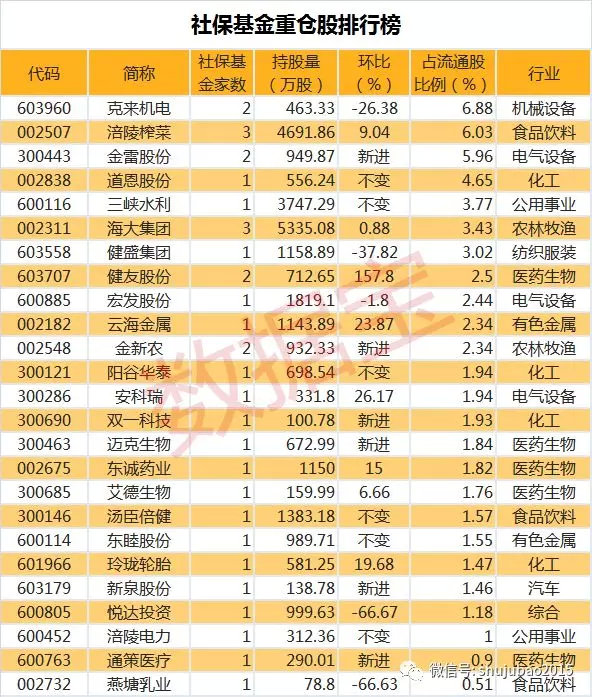 社保基金重仓股中,从前十大流通股东名单中社保基金家数来看,海大集团、涪陵榨菜均有3家社保基金集中现身,持股量分别为5335.08万股、4691.86万股;克来机电、金雷股份、健友股份、金新农等均有两家社保基金共同持有。