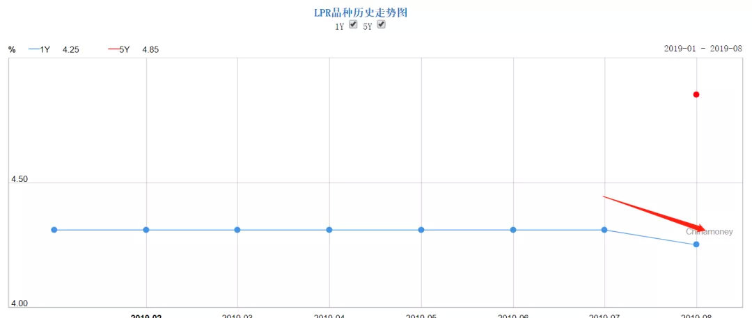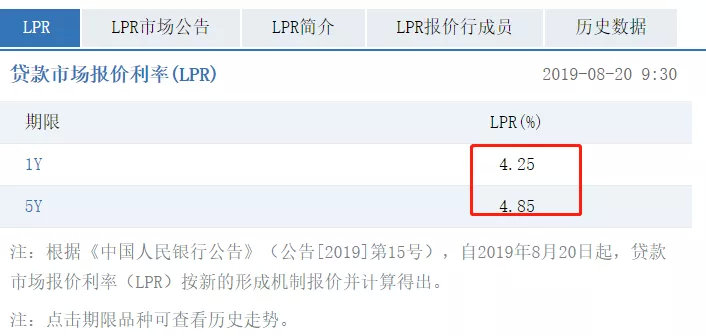 而今天,数据出来了,8月20日,中国人民银行授权全国银行间同业拆借中心公布,2019年8月20日贷款市场报价利率(LPR)为:1年期LPR为4.25%(此前为4.31%),5年期以上LPR为4.85%。以上LPR在下一次发布LPR之前有效。