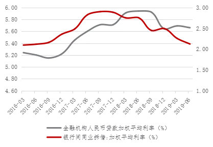 但实际上仍然有不少贷款是在贷款基准利率下浮一定比例,截至2019年二季度末,17.76%的贷款利率是在基准利率上下浮,此前最高下浮比例为10%(为3.915%)。