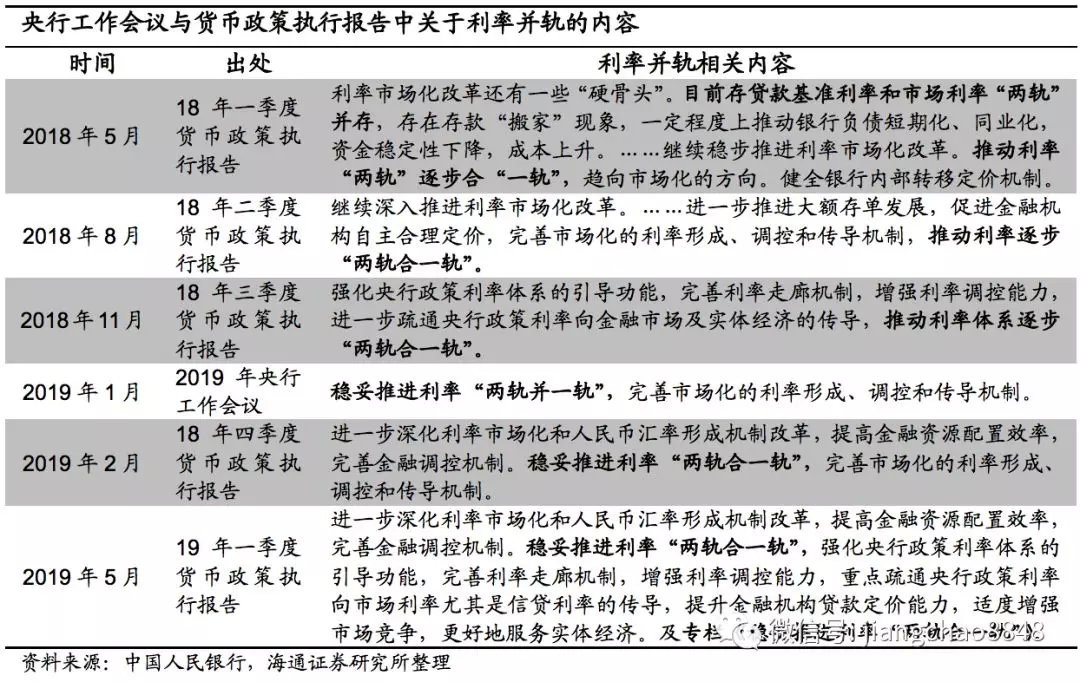 去年以来,央行对于推进利率“两轨合一轨”的声音逐渐增多,从18年一季度开始,之后每一期的《货币政策执行报告》都将其作为深化利率市场化改革的重要内容。19年一季度的《货币政策执行报告》更是以专栏进行探讨,指出稳妥推进贷款利率“两轨合一轨”,有利于增强市场竞争,促使金融机构更准确地进行风险定价,降低风险溢价,进一步疏通货币市场利率向贷款利率的传导,促进降低小微企业融资成本。