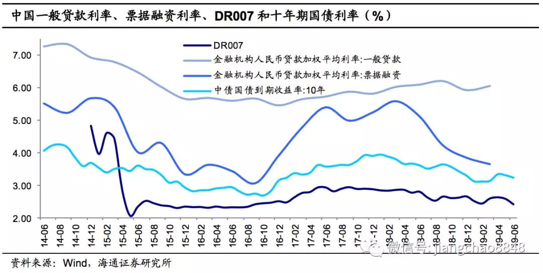 去年以来,人民银行多次降准给市场提供充裕资金,引导基准利率DR007中枢从18年一季度的2.8%以上回落到走廊下限2.55%附近,银行间和债券利率明显下行,但同期的一般贷款利率的变化却明显滞后。我国融资体系依然是银行信贷等间接融资为主,因而对贷款利率传导不足其实也就阻碍了实际融资成本的降低。
