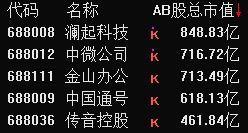 截至2020年1月13日,总市值排名前五的科创板上市公司分别为,澜起科技总市值849亿元、中微公司717亿元、金山办公713亿元、中国通号总市值618亿元、传音控股461亿元。