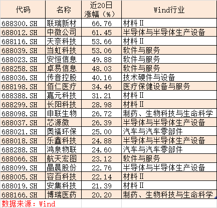 今日,科创板个股表现强势,中微公司大涨16.02%、华特气体上涨12.03%、长阳科技上涨11.88%,领涨两市。而从近20个交易日来看,科创板个股更是牛股频出,联瑞新材、中微公司、天奈科技、当虹科技累计上涨超过50%,20只个股累计涨幅超过了20%。
