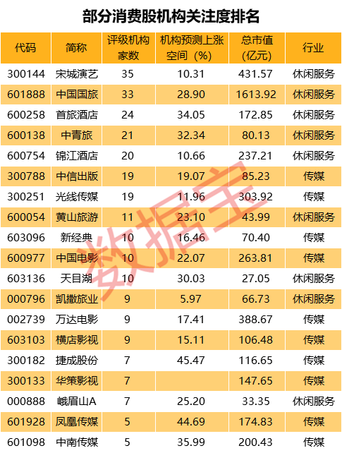 部分股票获机构高关注度,数据显示,上述消费股中有19只获5家以上机构评级,包括宋城演艺、中国国旅、中公教育、首旅酒店、中青旅等。