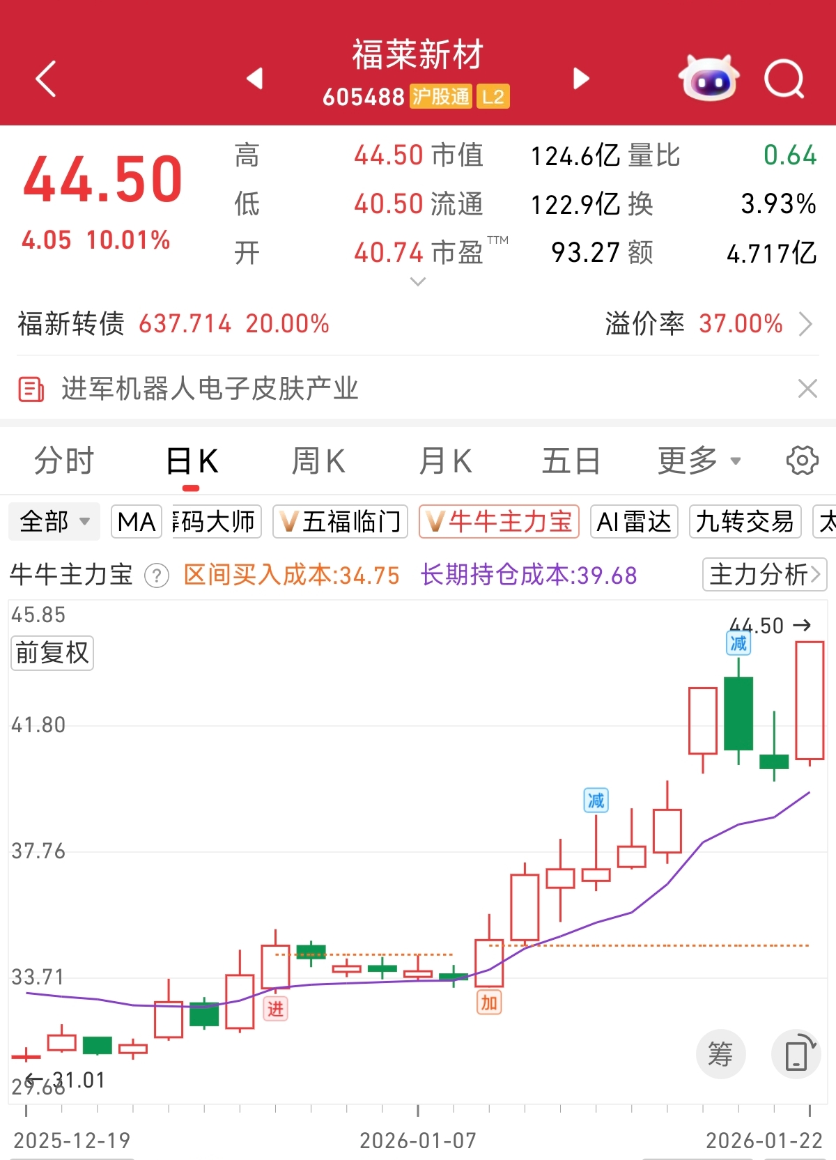 根据“主力宝”监控,今日大涨的福莱新材,12月30日出现了主力进场信号,在1月9日出现加仓信号。