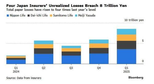 而最新数据显示,日本四家大型寿险公司公布的上一财年国内债券持仓浮亏已共计达到约600亿美元,这无疑进一步凸显出了日债收益率上升带来的风险。