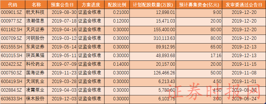 今年来,配股融资数量增加,除了目前已经实施配股的11家上市公司外,还有11家上市公司配股方案已获证监会发审委通过。从募资金额来看,天风证券、河钢股份、东吴证券、国海证券等募资金额居前。