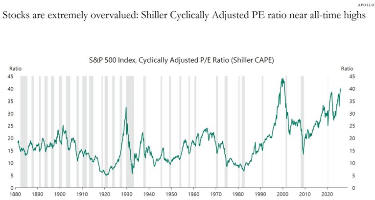 根据阿波罗全球管理公司的数据,股票估值正接近 145 年来的最高水平。