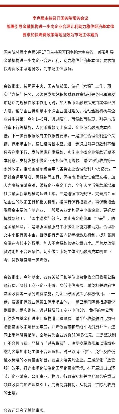 据中国政府网消息,国务院总理李克强6月17日主持召开国务院常务会议,部署引导金融机构进一步向企业合理让利,助力稳住经济基本盘;要求加快降费政策落地见效,为市场主体减负。