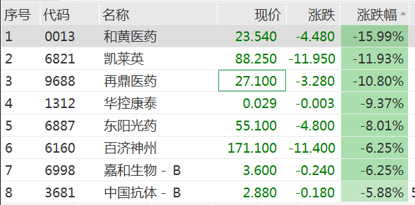 除了和黄医药,凯莱英、再鼎医药的跌幅也超过10%,东阳光药、百济神州、嘉和生物等同样跌超6%。