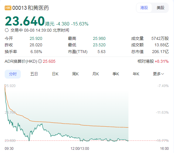 8月8日,李嘉诚旗下医药公司——和黄医药的股价出现大跌,盘中最低跌至23.52港元,最大跌幅超16%。截至发稿,和黄医药的股价仍跌超15%。