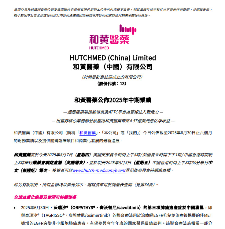 8月7日晚,和黄医药发布2025年中期业绩,收入总额2.78亿美元,同比减少9.16%;净利润4.55亿美元,同比增加1663.32%,于2025年6月30日的现金余额为13.6亿美元,主要得益于出售一家非核心合资公司的部分股权后4.16亿美元的税后出售收益及出售款项。
