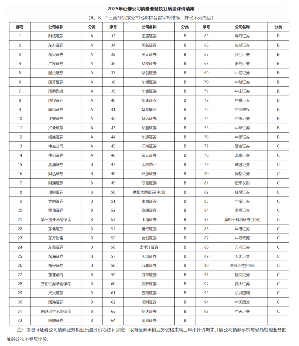 据证监会部署,中证协组织开展了2025年证券公司投行业务质量评价,评价对象包括2024年1月1日至12月31日开展股票保荐、债券承销、并购重组财务顾问和全国股转公司(北交所)相关投行业务的93家券商。评价结果分为三档,A类12家、B类66家、C类15家。