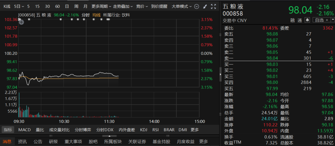 4月29日,A股白酒板块呈现普涨态势,五粮液成为少数逆势下跌的酒企。截至发稿,五粮液跌超2%,股价跌破100元/股关口。