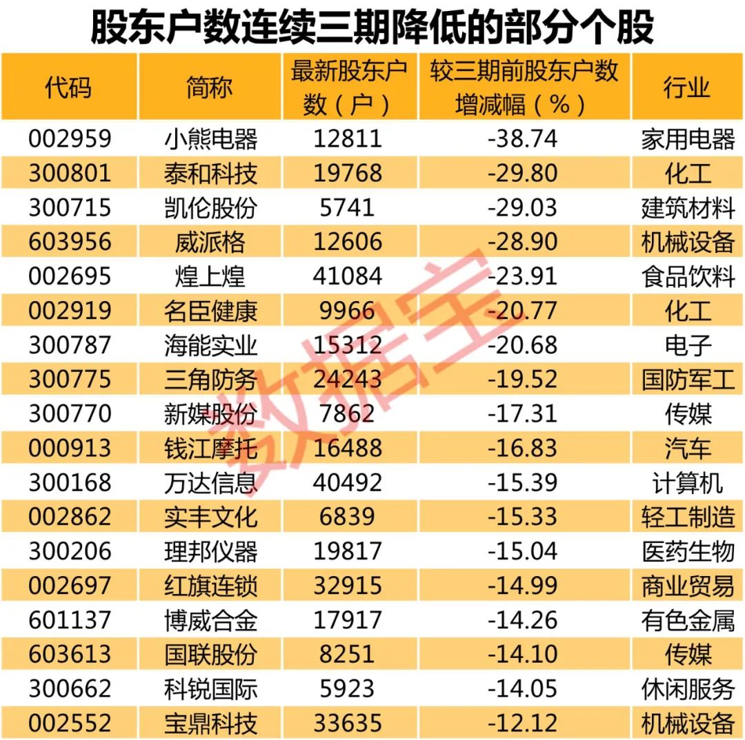 股东户数连续三期下降个股有61只,小熊电器降幅最大,相比三期前下降38.74%。其他股东户数降幅较大的还有泰和科技、凯伦股份等。