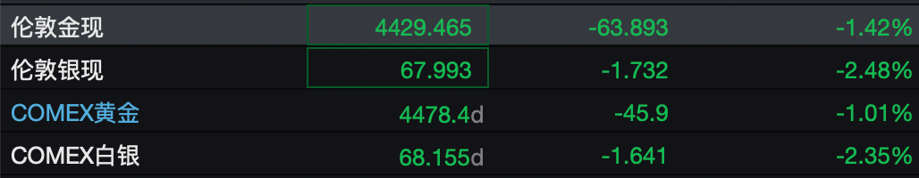 黄金、白银亦走低,目前,现货黄金下跌超1%,跌至4500美元/盎司下方,现货白银跌超2%。