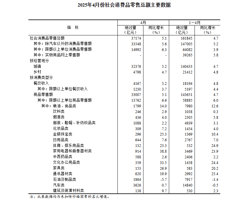 统计局数据显示,4月份,社会消费品零售总额37174亿元,同比增长5.1%。其中,除汽车以外的消费品零售额33548亿元,增长5.6%。1—4月份,社会消费品零售总额161845亿元,增长4.7%。其中,除汽车以外的消费品零售额147005亿元,增长5.2%。